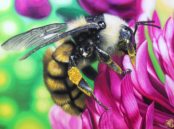 Karen's Artist Statement for "Ecosystem Heartbeat": "The cultural war on "weeds" and the unnatural aesthetics of the American grass lawn is actively harming pollinators, threatening ecosystems at large. I have discerned that even those who dislike insects can not only recognize a bumble bee, but also emotionally connect to it better than other insects. I hope the viewer is able to connect to the micro beauty of the bumblebee and reflect on pollinators' importance for all life to thrive. I also want viewers to consider allowing these no-care-required natural food sources to exist, for the sake of our pollinators, and; consider other ways they can support local pollinators."